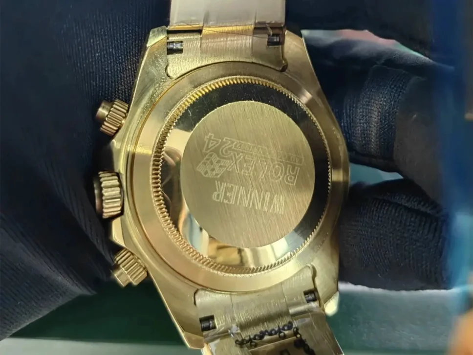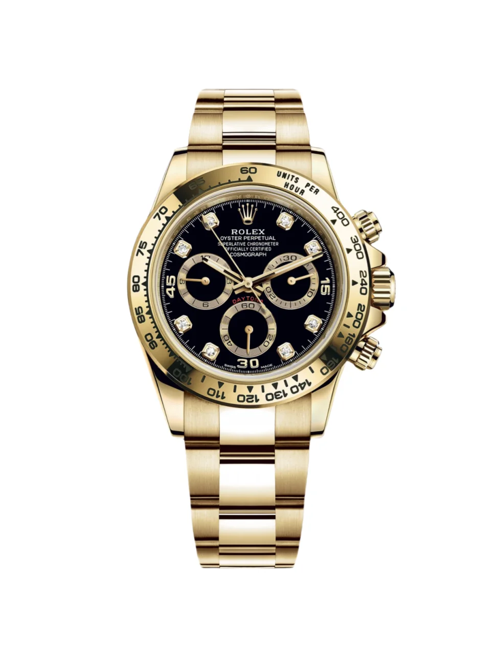REFERENCE116508MODEL CASEOyster, 40 mm, yellow goldBEZELFixed, with engraved tachymetric scale, in 18 ct yellow goldWATER-RESISTANCEWaterproof to 100 metres / 330 feetMOVEMENTPerpetual, mechanical chronograph, self-windingCALIBRE4130, Manufacture RolexPOWER RESERVEApproximately 72 hoursBRACELETOyster, flat three-piece linksDIALBlack set with diamondsCERTIFICATIONSuperlative Chronometer (COSC + Rolex certification after casing)Rolex Cosmograph Daytona in Gold, m116508-0016 | Europe Watch CompanyBlack dialThis model features a black, diamond-set dial with snailed counters, gold applique hour markers and hands with a Chromalight display, a highly-legible luminescent material. The central sweep seconds hand allows an accurate reading of 1/8 second, while the two counters on the dial display the lapsed time in hours and minutes. Drivers can accurately map out their track times and tactics without fail.Rolex Cosmograph Daytona in Gold, m116508-0016 | Europe Watch CompanyThe tachymetric scaleWith its tachymetric scale, its three counters and its pushers, the Cosmograph Daytona was designed to be the ultimate timing tool for endurance racing drivers. The bezel features a tachymetric scale to read average speed over a given distance based on elapsed time. This scale offers optimal legibility, making the Cosmograph Daytona the ideal instrument for measuring speeds up to 400 units per hour, expressed in kilometres or miles.Rolex Cosmograph Daytona in Gold, m116508-0016 | Europe Watch Company18 ct yellow goldBy operating its own exclusive foundry, Rolex has the unrivalled ability to cast the highest quality 18 ct gold alloys. According to the proportion of silver, copper, platinum or palladium added, different types of 18 ct gold are obtained: yellow, pink or white. They are made with only the purest metals and meticulously inspected in an in-house laboratory with state-of-the-art equipment, before the gold is formed and shaped with the same painstaking attention to quality. Rolex’s commitment to excellence begins at the source.Rolex Cosmograph Daytona in Gold, m116508-0016 | Europe Watch Company