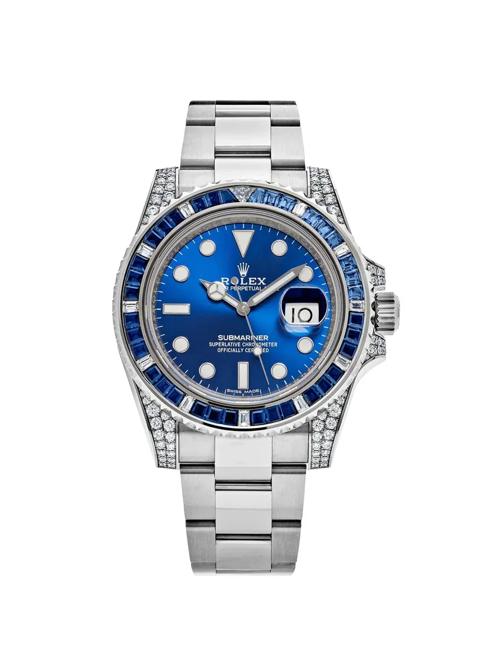 The vibrant blue lacquered dial is accented with Chromalight-filled hour markers and Mercedes-style hands for optimal legibility underwater or on land. A date display at 3 o’clock, magnified by the Cyclops lens, adds practical utility to its opulent design.